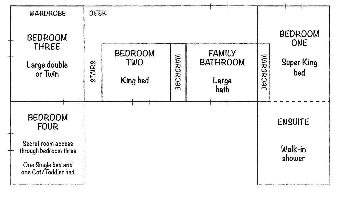Bedroom one, Super King-size bed, ensuite WC / basin / walk-in shower